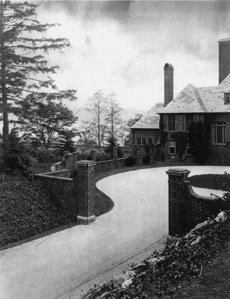 Ralph Matthiessen's 1925 mansion, designed by architect James C. MacKenzie Jr., was built on the site of the forrmer Charles Lewis Tiffany home in what was originally called Tiffany Park, now Matthiessen Park. This is a view of the mansion's front entrance looking northwest over the nearby Hudson River (left rear). (Dix Duryea Photography, The Architectural Record, November 1928) |